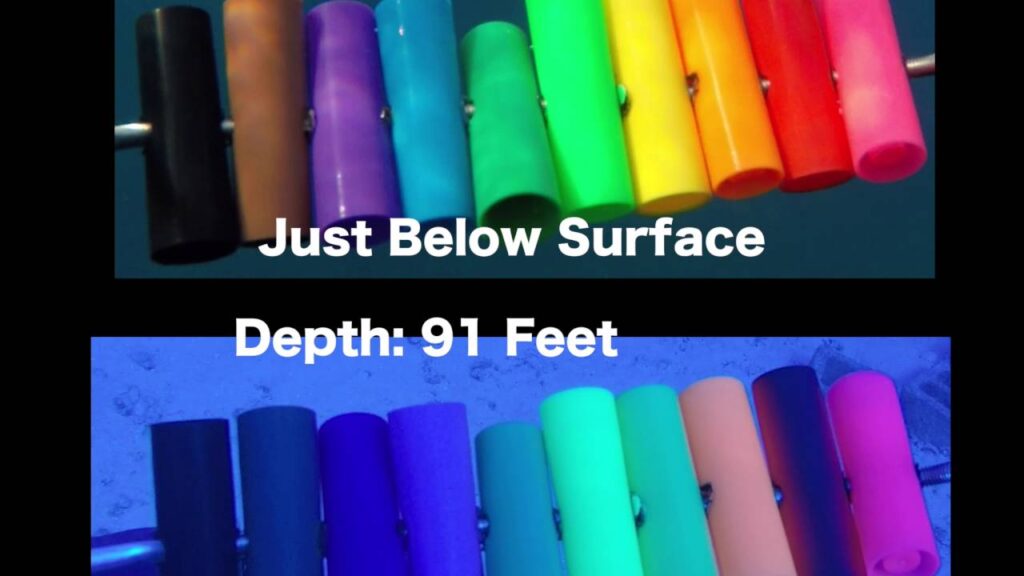 Colors changes dramatically with water depth and clarity in both salt water and freshwater with multiple colors baits will show up better as shown in the example